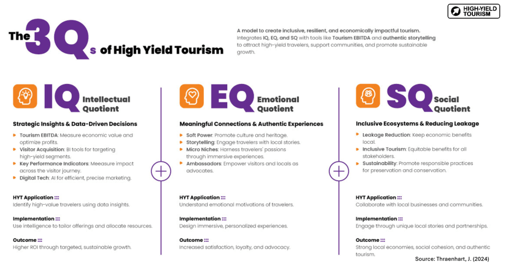 High-Yield Tourism applies this strength-based thinking to destination strategy. Rather than targeting “everyone” or competing on features destinations lack, it focuses on optimizing what makes each place genuinely distinctive. High-yield travelers stay longer, spend more, engage meaningfully with local culture, and become passionate ambassadors. The goal is creating resilient, sustainable visitor economies benefiting all stakeholders – residents, businesses, governments, and travelers.